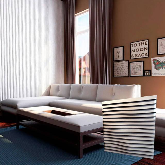 3D панели Линии одна из лидеров продаж. Рисунок этой плитки представляет слегка искривленные горизонтальные линии, которые великолепно вписываются в спальню, зал, гостиную, офис, ванную, монтаж возможен как и горизонтально, так и вертикально. Окрашенные в любой цвет, в сочетании с верхней и нижней подсветкой создают приятный эффект.