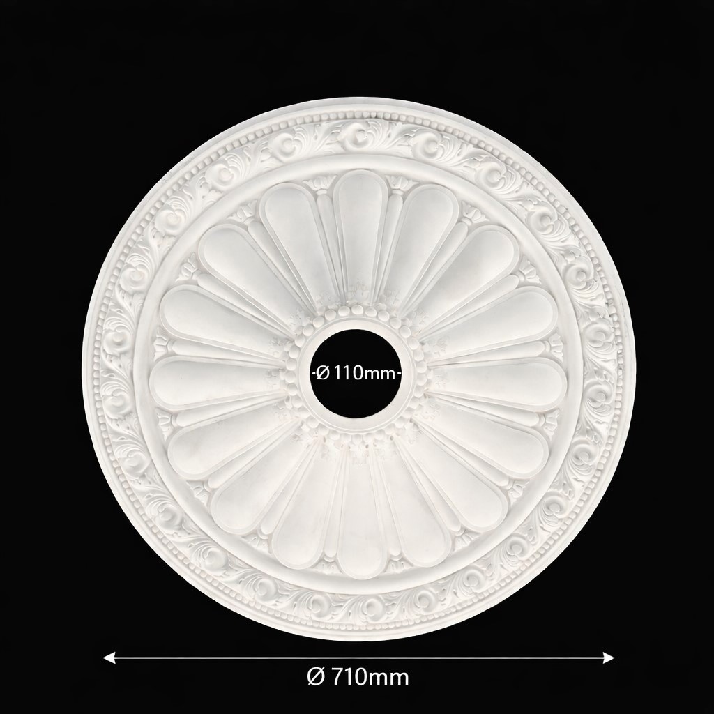 Розетка потолочная из гипса Р-32 диаметром Ø710 мм — это изысканный элемент декора, который, безусловно, привнесет классический шарм в ваш интерьер. В первую очередь, данная средне — размерная розетка с круглой формой гармонично вписывается в различные стили, включая классику, арт-деко, модерн, эклектику и даже минимализм. Таким образом, она идеально подходит для создания уникальной атмосферы в любом помещении.